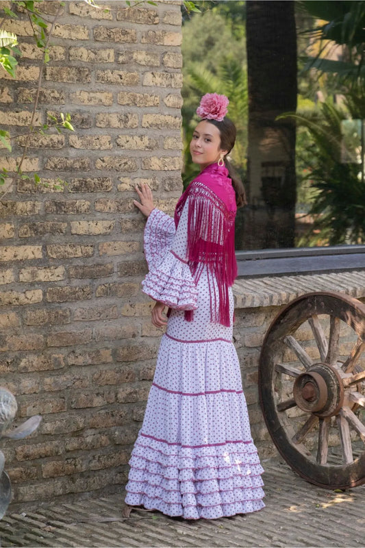 Tientos de Seda Dress - White & Pink Flamenco Dress for Teens with Canastera Skirt