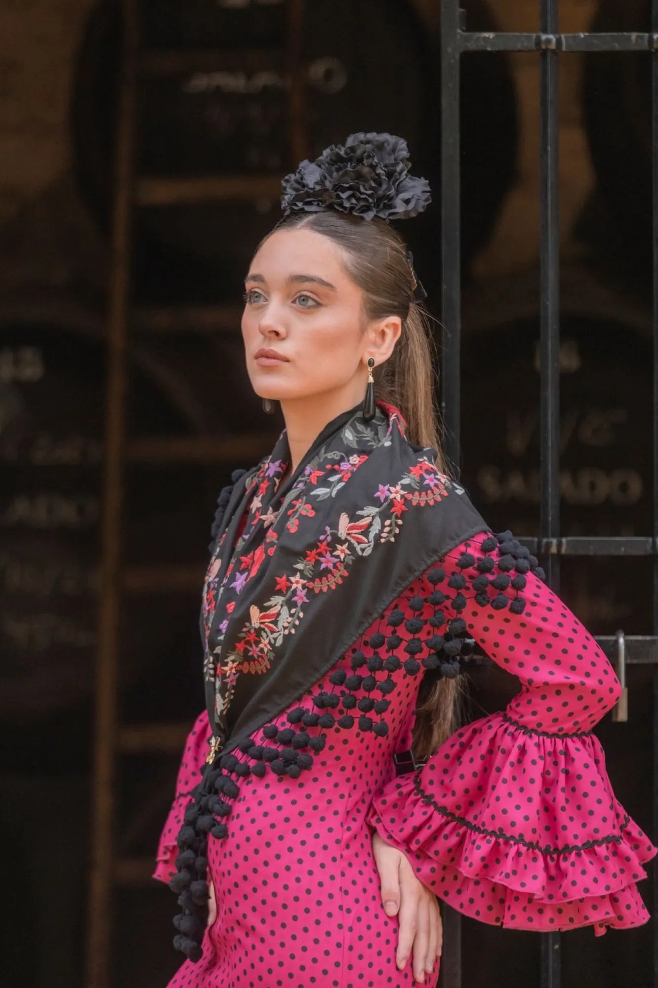 Authentic flamenco dress for women crafted in vibrant fuchsia with traditional black polka dots, designed in a classic fitted silhouette that opens into a tiered ruffled skirt for authentic flamenco movement. The long sleeves with layered volantes and the contrasting black trimming reflect the timeless structure of Andalusian dressmaking, offering elegance, volume, and fluidity with every step.