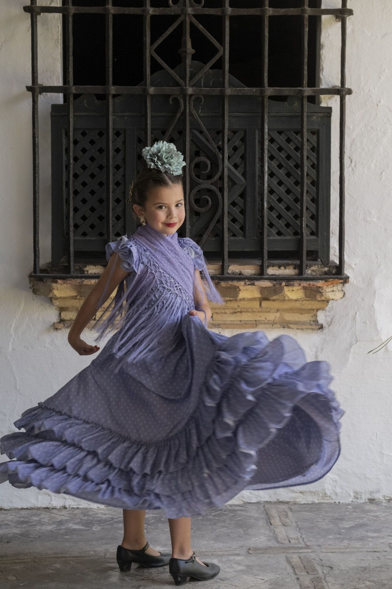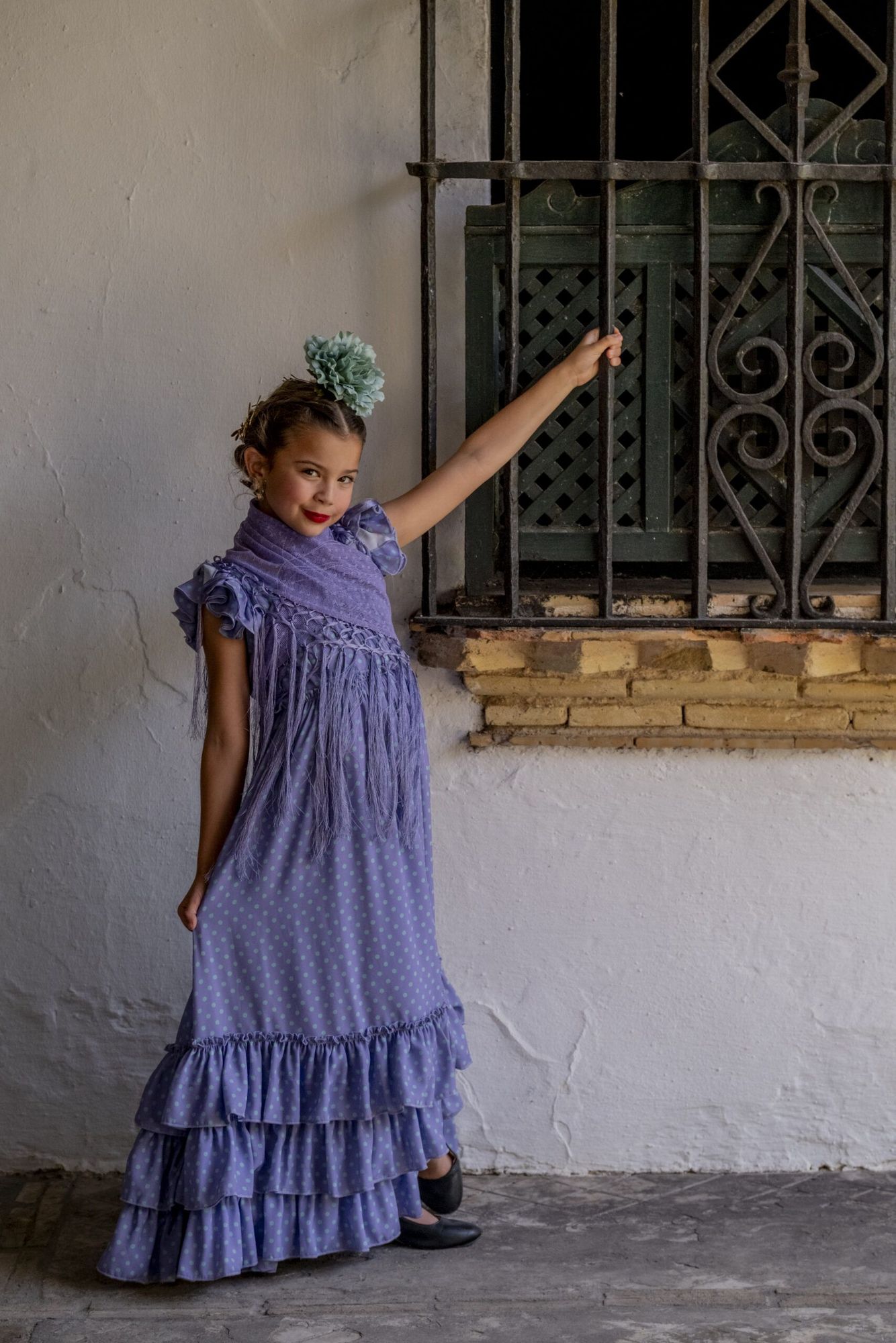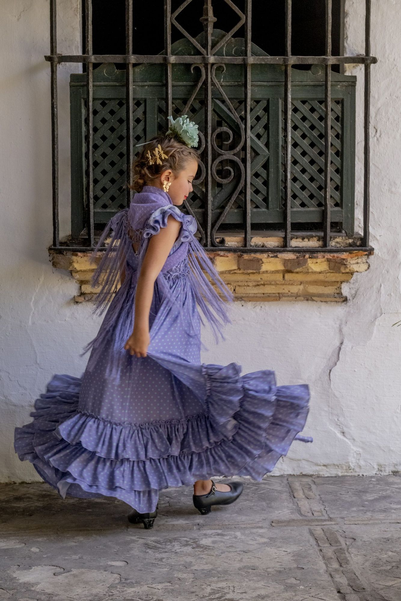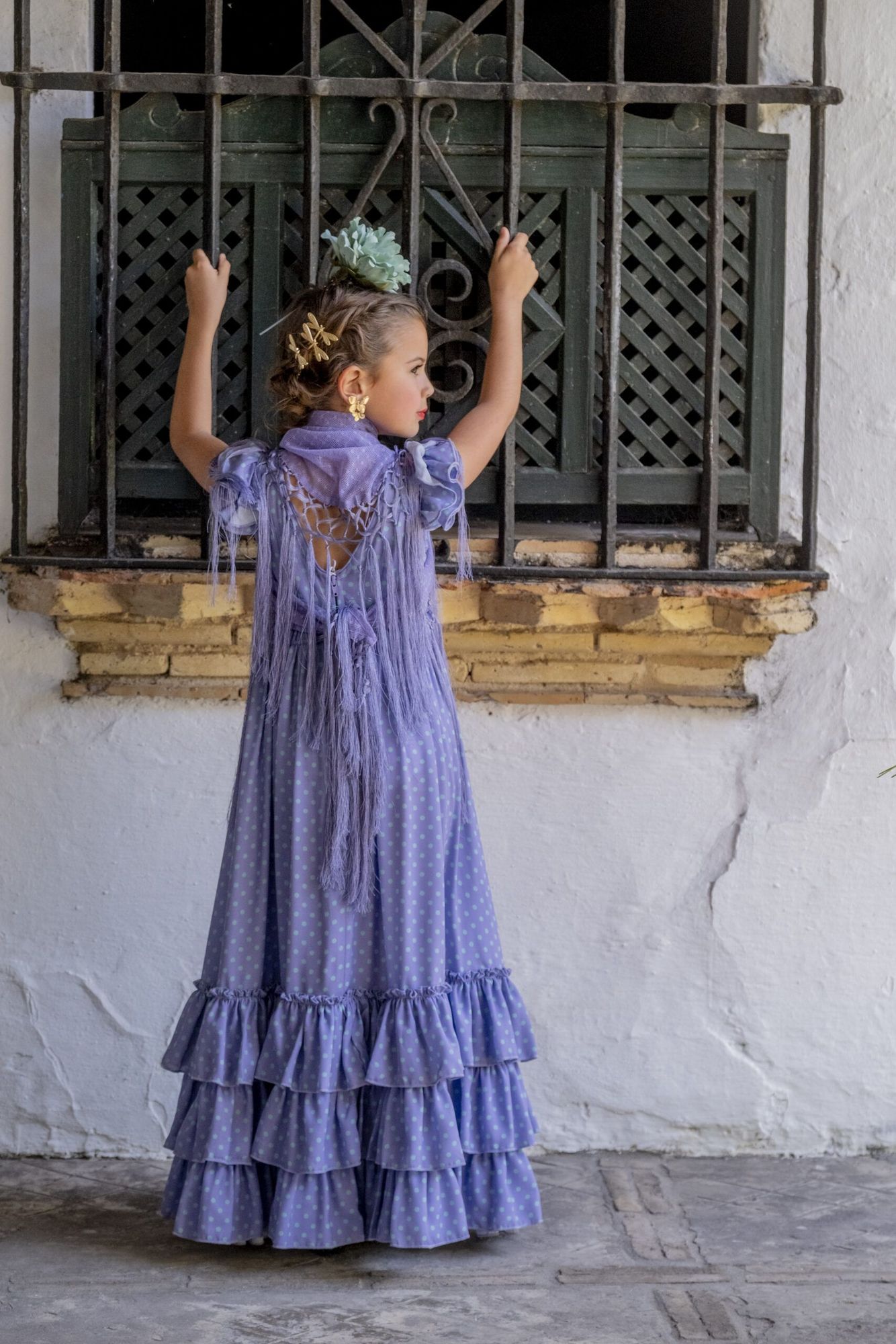 Flamenco dress for a young girl in lavander with small pastel green polka dots. It features a high waist, long sleeves, and a gathered skirt with two ruffled layers.