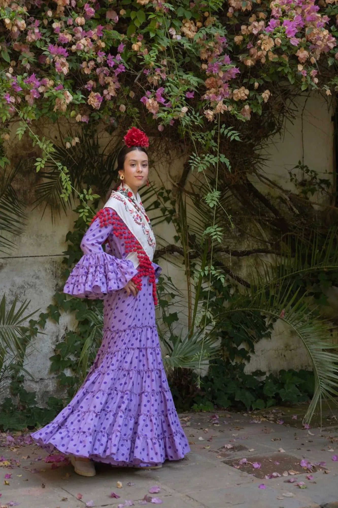 The soft purple palette and classic flamenco silhouette create a charming, standout look. Ideal for festive moments where authenticity and style come together.