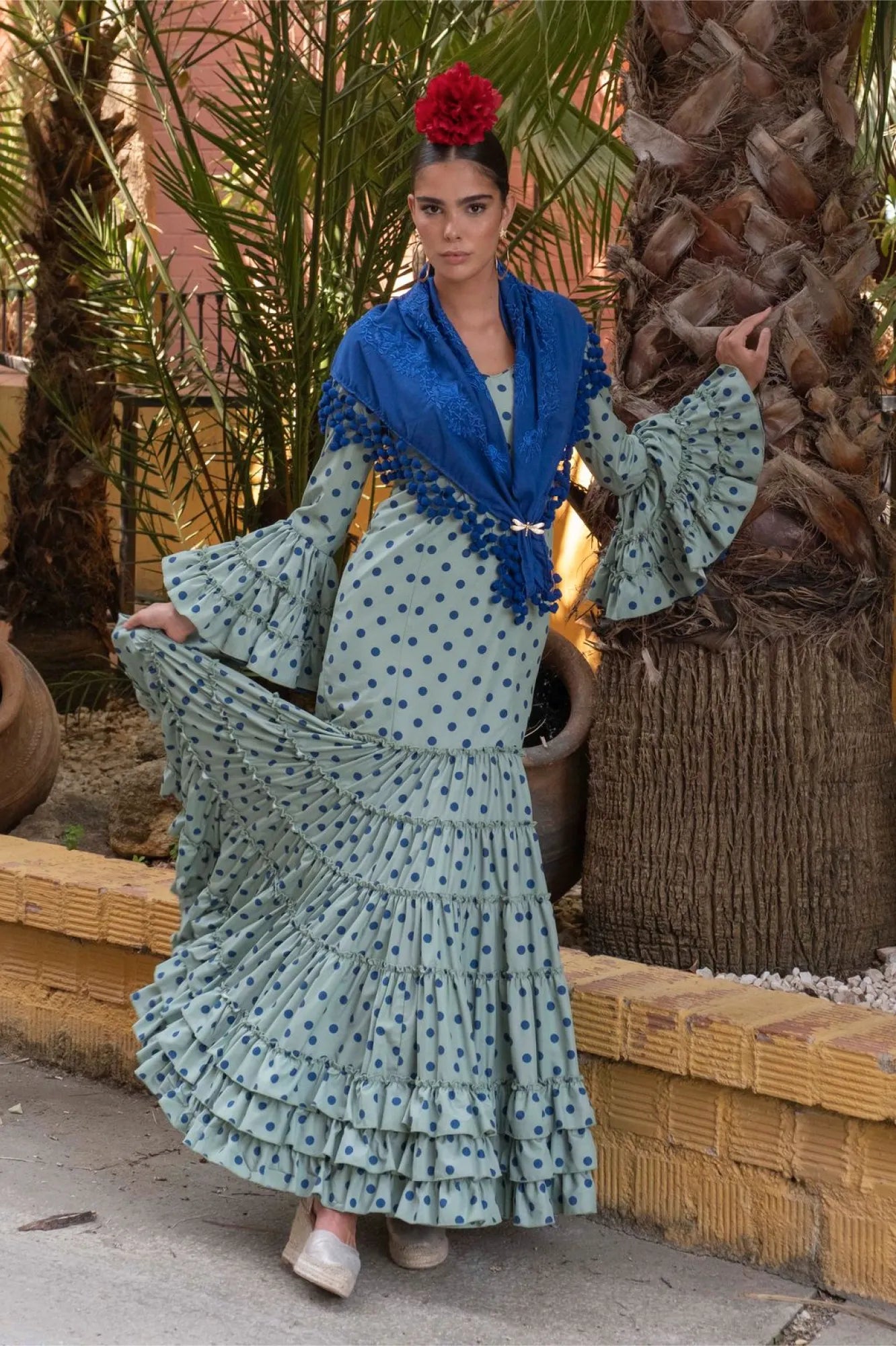 Flamenco dress for women in green with blue polka dots, featuring long sleeves and a traditional canastera skirt for added volume and smooth, elegant movement. Lightweight and comfortable, this classic design is ideal for fairs, festivals, cultural events, and photoshoots combining vibrant color, authentic style, and a timeless flamenco silhouette.